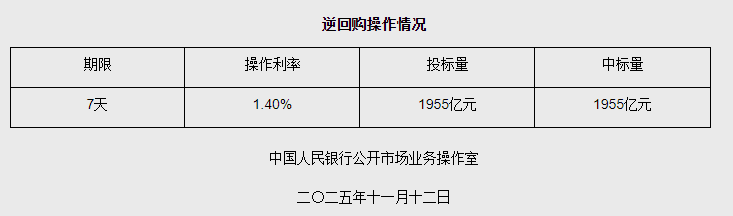 11月12日电 据央止网站新闻,2025年11月12日中原国民银止以牢固利率、数目投标体例启铺了1955亿元7天期顺归买掌握。详细环境以下:
